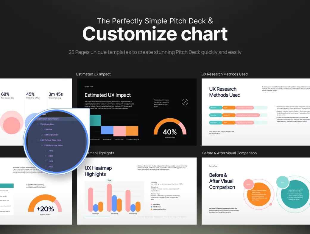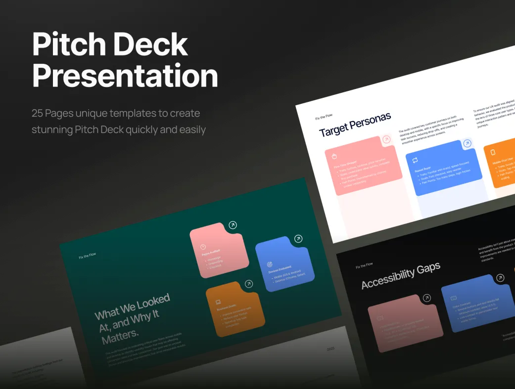 این بخشها با ۲۵ اسلاید کامل، سازماندهیشده و آسان برای سفارشیسازی، همراه با راهنمای سبک و فایلهای Fig، Deck، PPTX و PDF هستند.