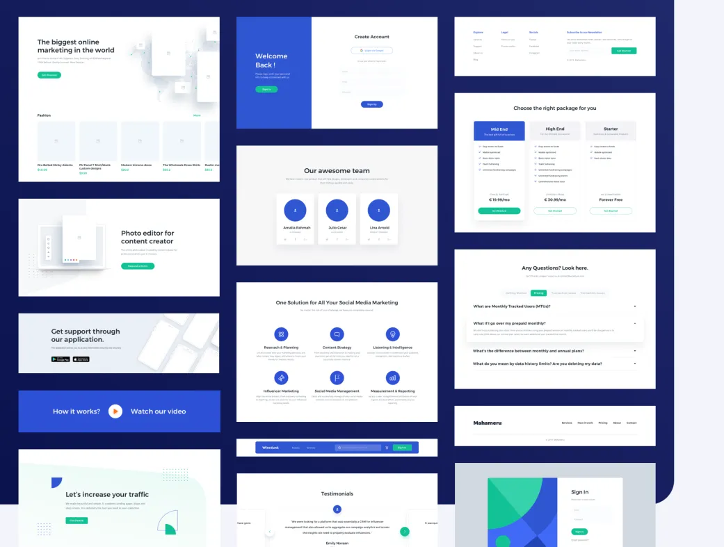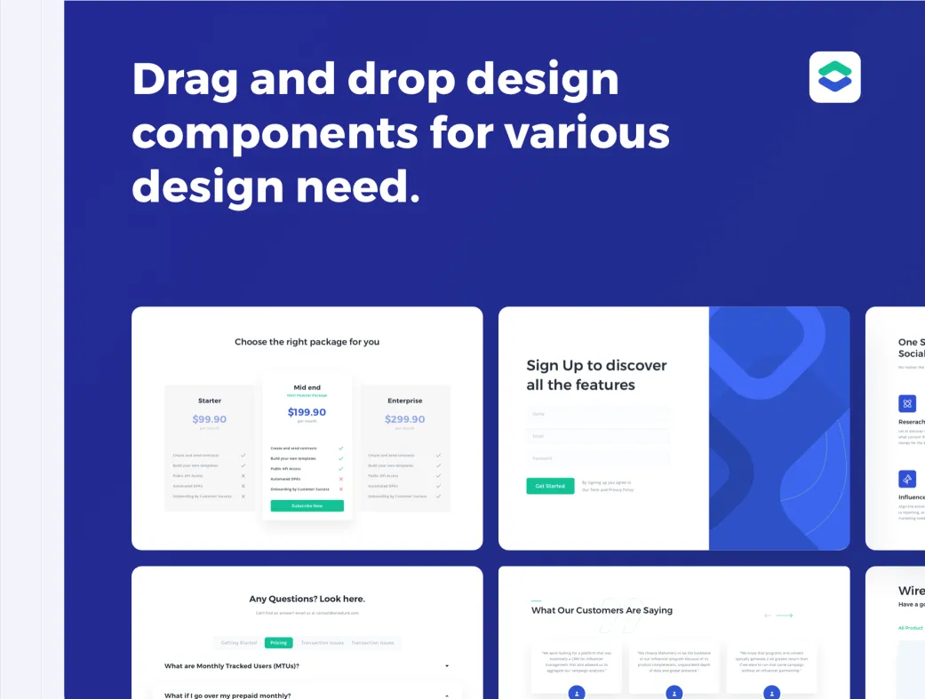از دیگر مزایای این قالب میتوان به نسخه موبایل آن اشاره کرد که تجربه کاربری بینظیری را در تمامی دستگاهها فراهم میآورد. با امکان بهروزرسانی رایگان، شما همیشه به جدیدترین امکانات و ویژگیها دسترسی خواهید داشت. همچنین، قابلیت کشیدن و رها کردن اجزای طراحی برای نیازهای مختلف به شما این امکان را میدهد تا به سادگی از 15 دستهبندی کامپوننت (شامل هدر، محصولات، تجارت الکترونیک، محتوا، وبلاگ، فراخوان به عمل، فرمها، نظرات، تیمها، قیمتگذاری، ویژگیها، سوالات متداول، و مودالها) استفاده کنید.