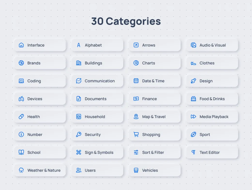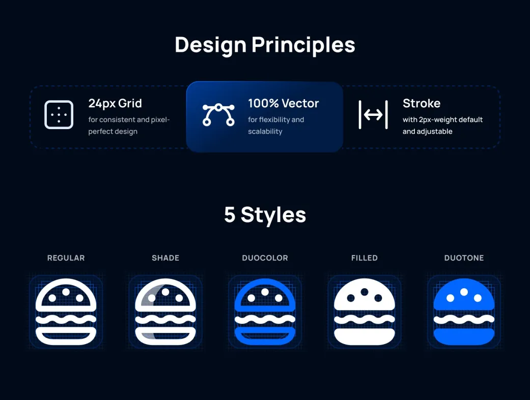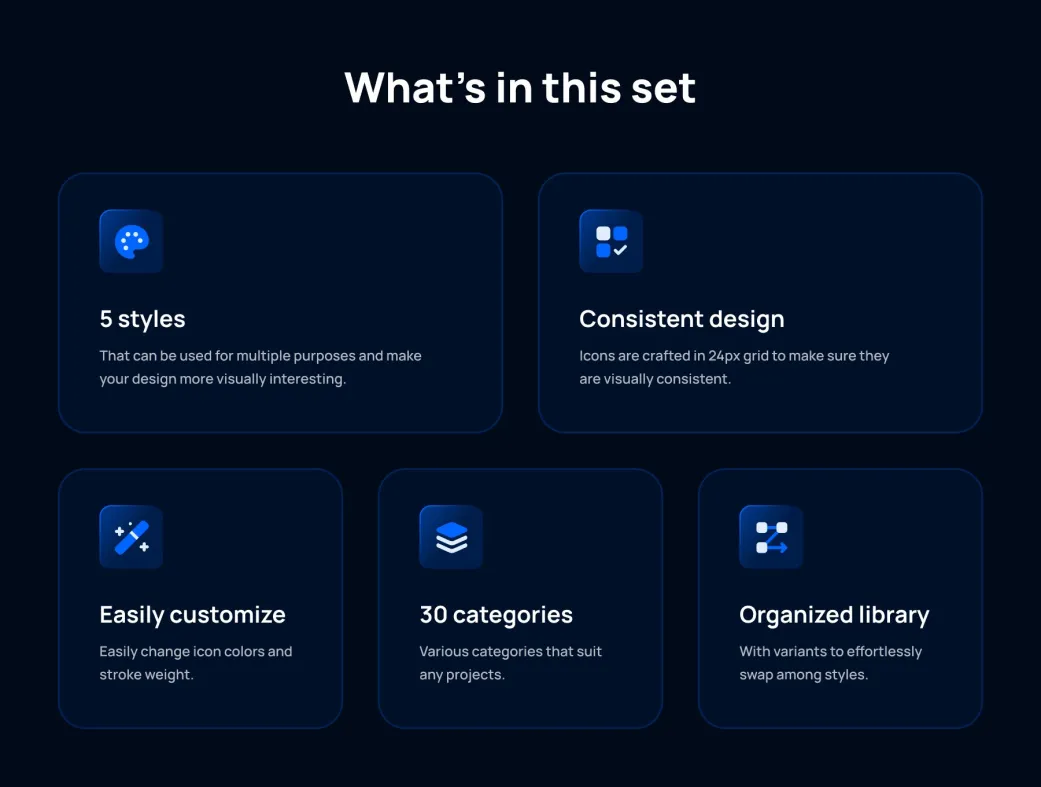 اوربیکون بیش از ۱۶۰۰ آیکون در ۵ سبک مختلف ارائه میدهد و در ۳۰ دستهبندی پرطرفدار سازماندهی شده است. فایل ZIP شامل تمام آیکونهای وکتور است که مستقیماً در فیگما قابل import هستند.
