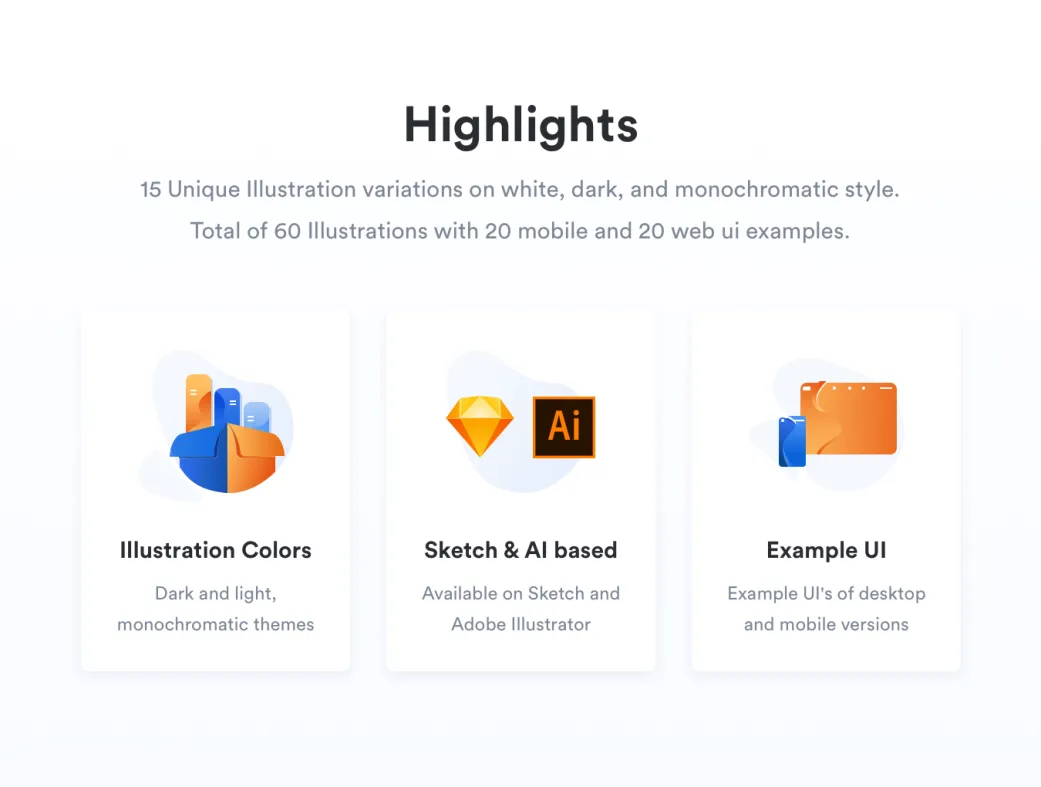 این مجموعه شامل ۱۵ طرح منحصربهفرد است که در ۴ تم رنگی (سفید رنگی، سفید تکرنگ، تیره رنگی، تیره تکرنگ) ارائه شده و مجموعاً ۶۰ ایلاستریشن وکتور ۱۰۰% قابل سفارشیسازی را در بر میگیرد. استفاده از این ایلاستریشنها نرخ تبدیل پروژههای شما را با جذابیت بصری بالا افزایش میدهد.